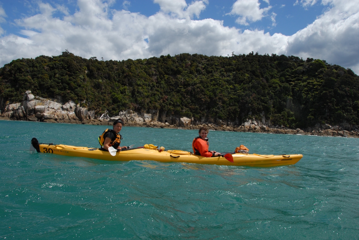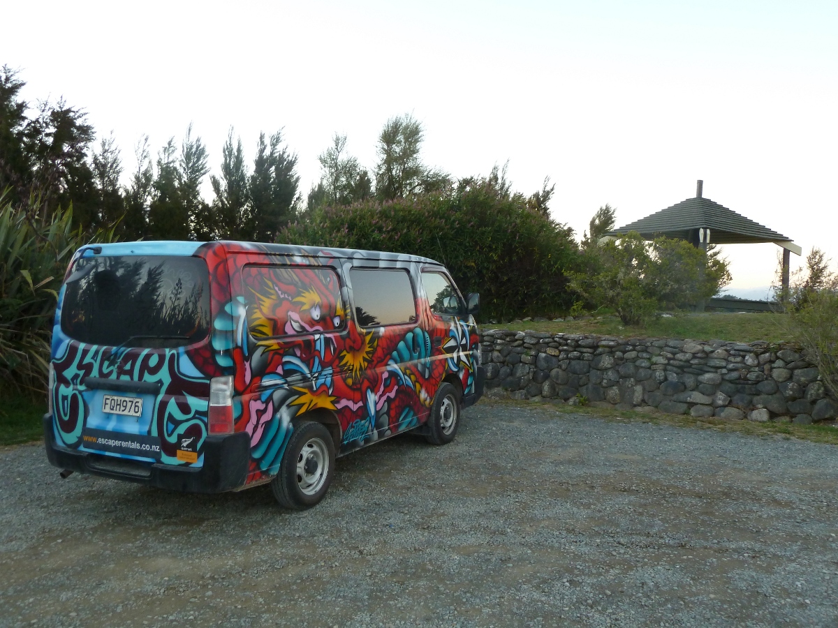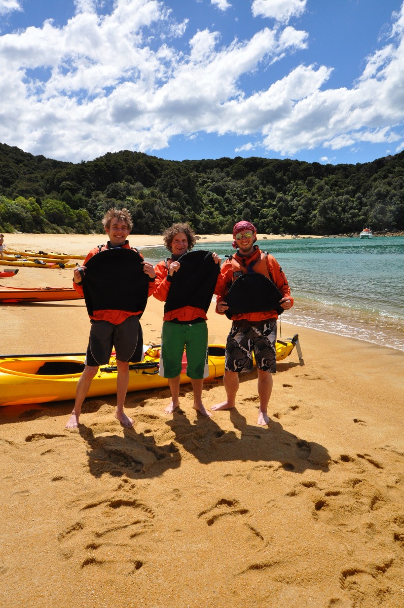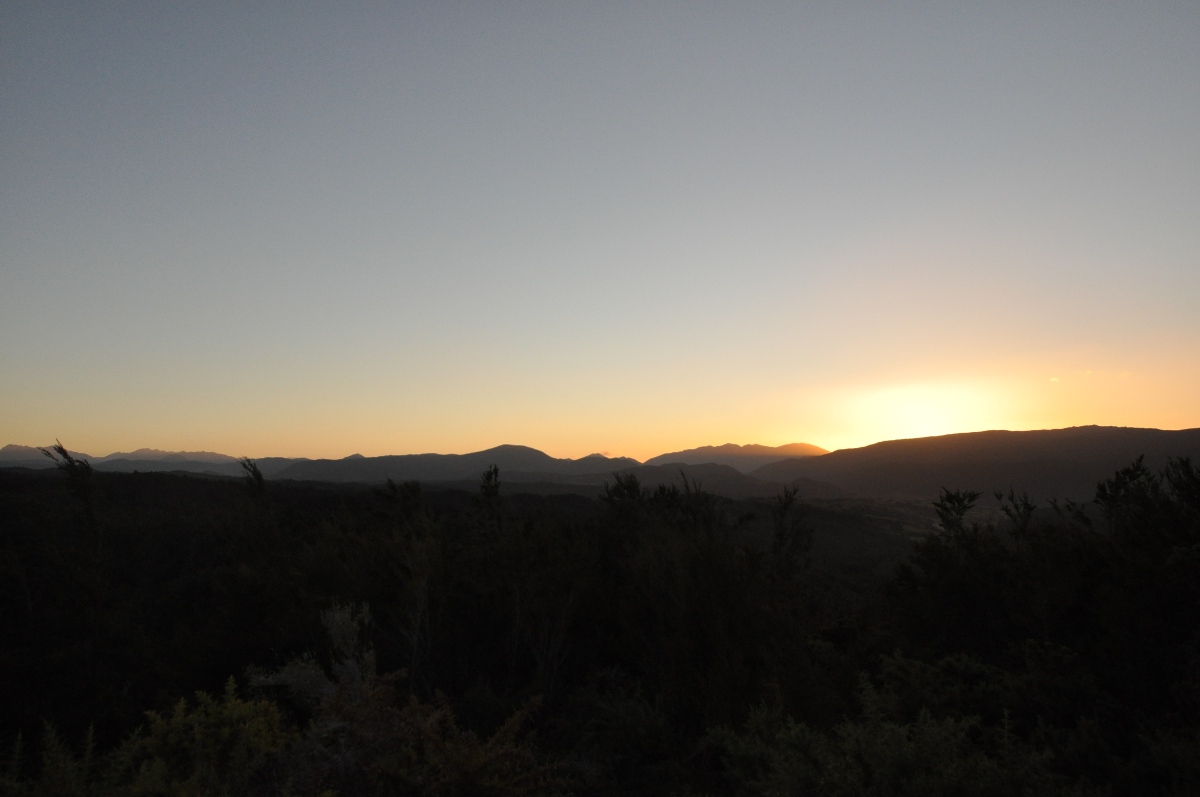 Die Tour die wir gebucht hatten führte uns als erstes per Wassertaxi in die Bark Bay von wo aus wir zuerst einen 2 stündigen Fussmarsch in die Torrent Bay (nicht Pirate- ;-)) vor uns hatten. Nach einer stündigen Mittagspause inkl. baden wurden wir wieder vom Wassertaxi abgeholt und nach Watering Cove, einem kleinen Strand, gebracht. Dort nahm uns Michelle, unsere Kajak Führerin, in Empfang und führte uns in die Kunst des Kajak Fahrens ein. Wir paddelten während ca. einer Stunde nach Anchorage. Nach einer kurzen Pause holte das Wassertaxi uns mit samt Kajak wieder ab und brachte uns zurück nach Marahau. Von dort gings direkt weiter in den Süden bis wir auf einem Aussichtspunkt bei beissender Kälte unser Nachtlager beim Aussichtspunkt auf dem “Hope Saddle” aufschlugen. Die Aussicht am nächsten morgen war leider nicht ganz so überzeugend. Alle Touris die während unseres Frühstücks ankamen waren nach spätestens 10 min. wieder weg.