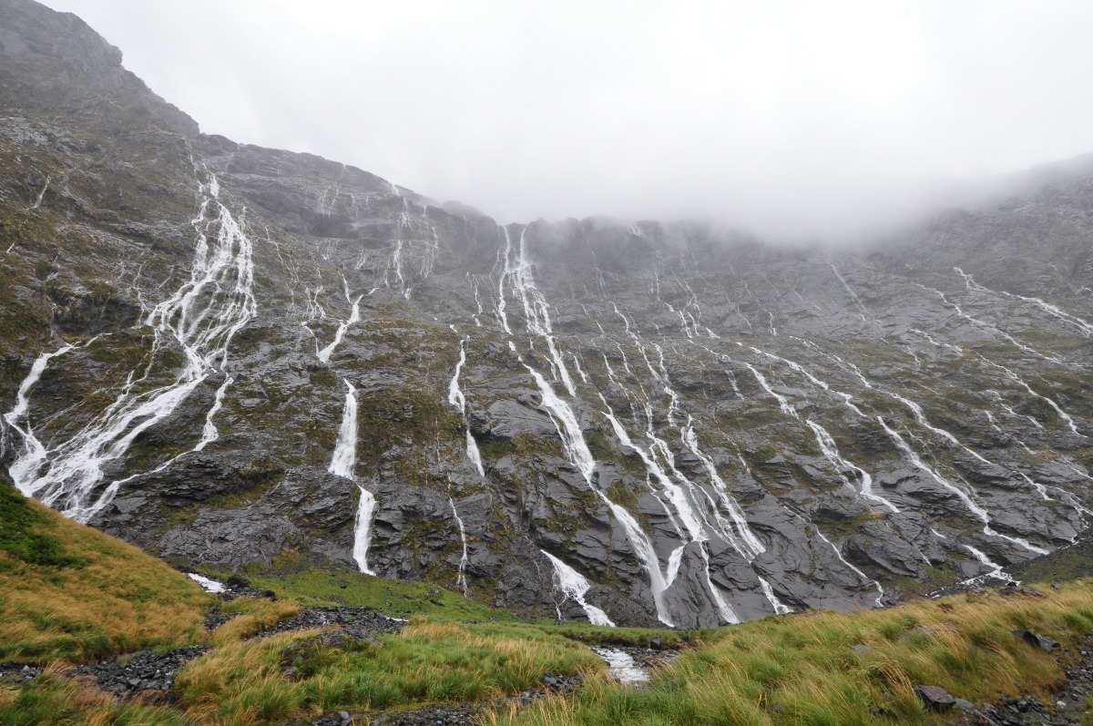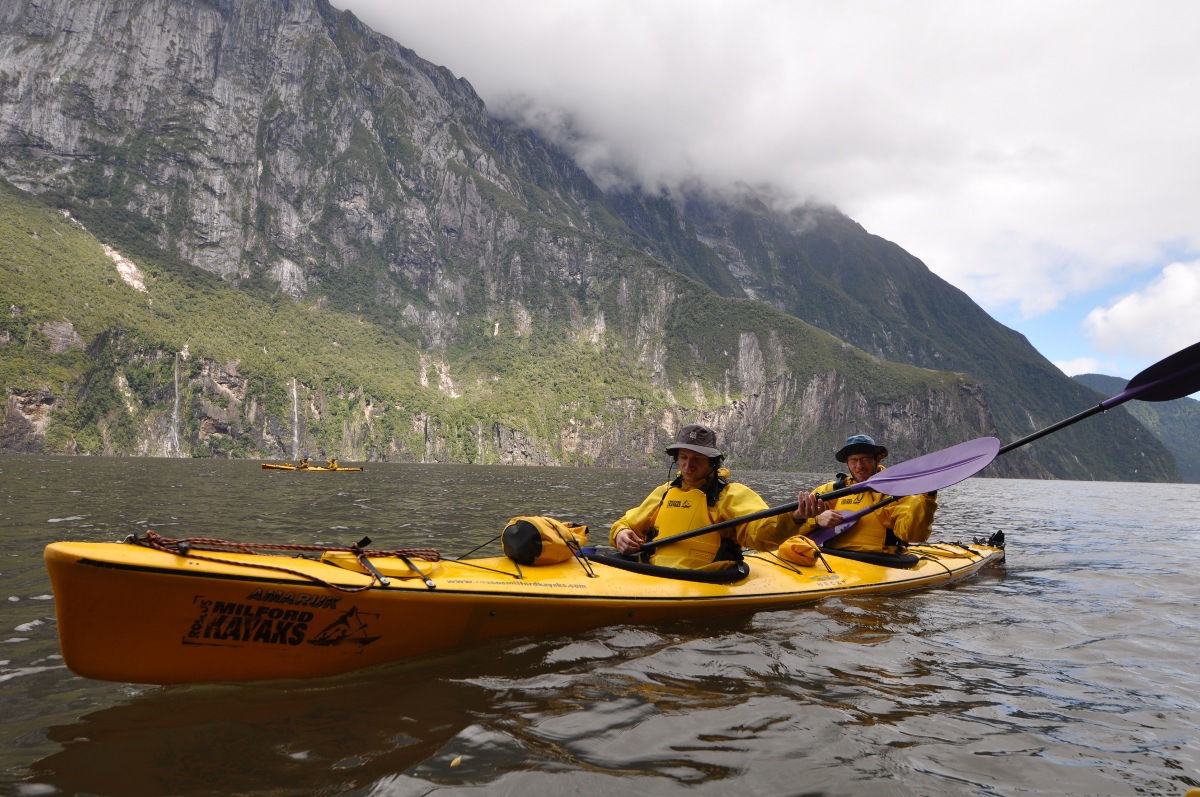 Freude herrschte am nächsten Morgen: Nein, es hat nicht nur aufgehört zu regnen, es waren sogar an einzelnen Stellen blauer Himmel auszumachen! Auf ging es zum Treffpunkt für die Kajaktour, wo uns “Täsch” (Natascha) begrüsste. Mit vier anderen Abenteuerlustigen gings zum Hauptquartier wo wir eingekleidet wurden. Nach einer kleiner Bootsfahrt wurden wir direkt nach den Stirling Falls zu Wasser gelassen. Unter diese Wasserfälle durften wir dann auch wenig später paddeln, wobei der Gegenwind so stark war, das es unmöglich war bis zum Wasserfall vorzudringen. In gemütlichen vier Stunden paddeln ging es zurück zum Dorf Milford Sound, vorbei an den Wasserfällen und den beeindrucken steilen Felswände.