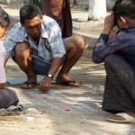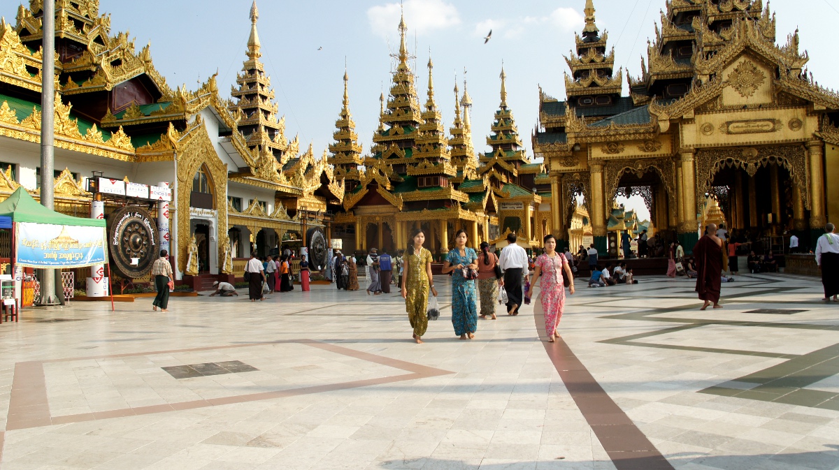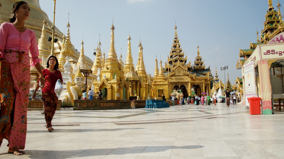 Nun ist es soweit. Wir lernen unsere Reisegruppe kennen. Eingestellt sind wir auf 60+ (Durchschnittsalter im Hotel). Mit Freude stellen wir fest, dass Sandra, Michi & Uwe in unserem Alter und sehr unkompliziert sind. Auf dem Markt geht es erst mal zum Geldwechseln von Dollar in Kyat im hinteren Teil eines Kiosks. Gut nachzählen ob man nicht hinters Licht geführt wird ist angesagt. Unser nachmittägliche Höhepunkt ist die Shwedagon Pagode. Die beeindruckende Stupa haben wir schon vom Hotel aus bewundert, nun auch aus der Nähe. Der weisse Marmor und das viele glitzernde Gold bringt uns zum Staunen. Die 7000 Diamanten und Edelsteine können wir leider nicht erkennen. Die furchtbar heissen Steinplatten schmerzen bald unsere nackten Füsse.