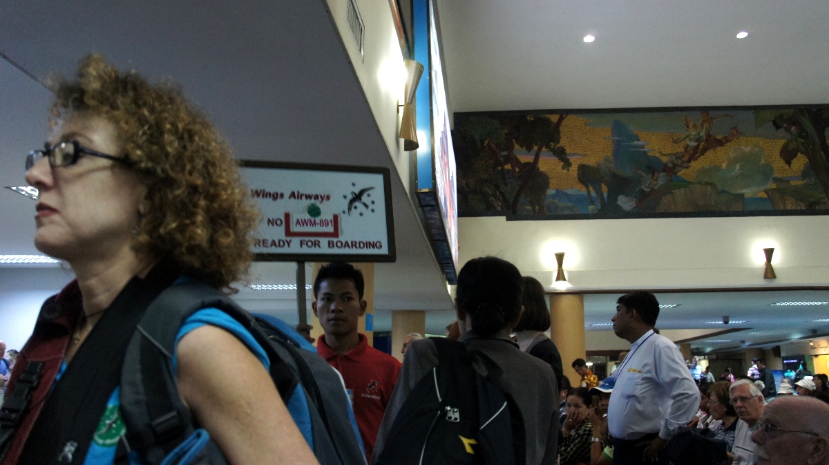 Schampar früh müssen wir los zum Flughafen. Die Handgepäckkontrolle wird im Schnellzugstempo durchgeführt (Wasser ist hier kein Problem, nur Waffen). So sitzen wir schon bald in der Wartehalle und mampfen den Inhalt unseres Breakfast-Bags und beobachten das Geschehen. Elektronische Anzeigen gibt es keine. Man erhält aber farbige Sticker aufgeklebt. Wenn das Boarding beginnt, läuft ein Mann mit einem Schild herum und bringt die Personen mit dem passenden Sticker zum Gate (in Yangon A oder B). Diesen Prozess durchlaufen wir auf dieser Reise noch des Öftern. Sogar freie Platzwahl ist angesagt. Amusing!