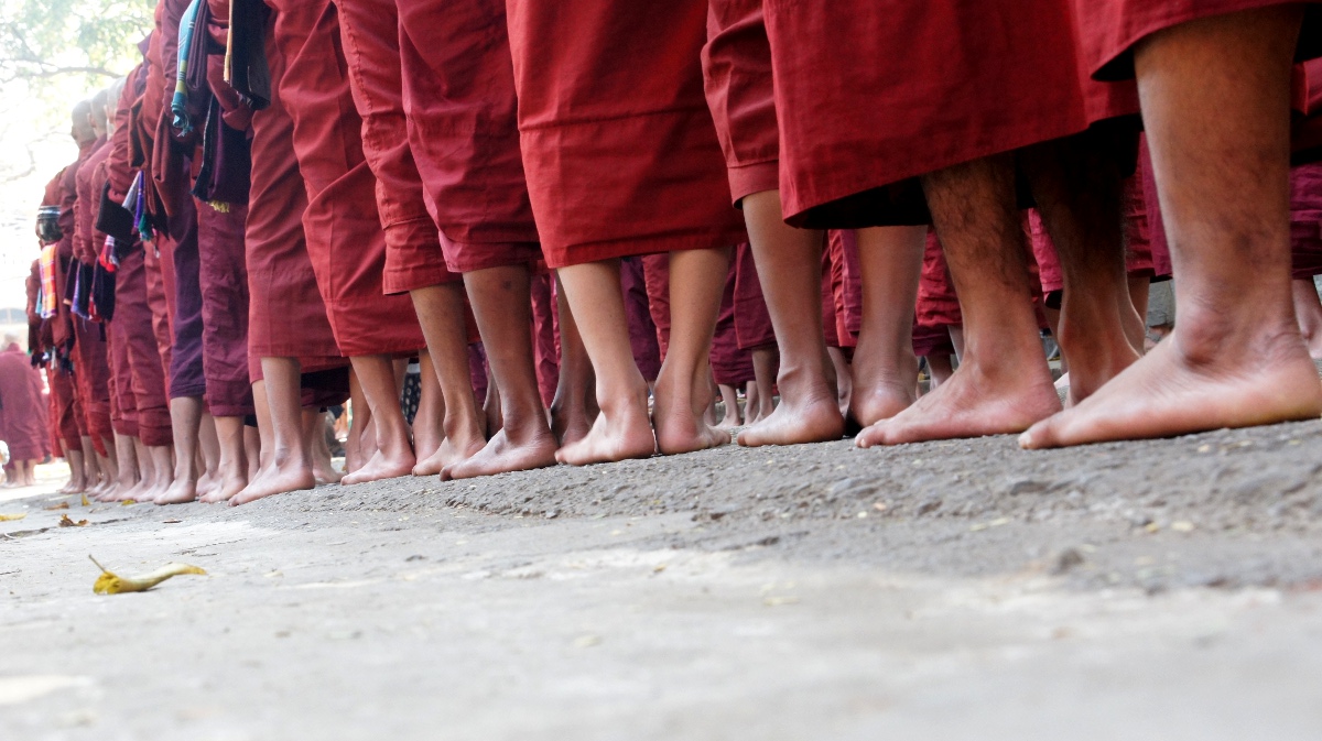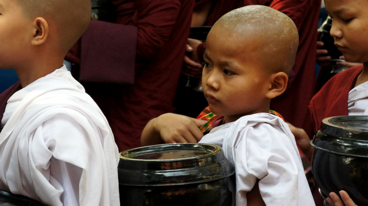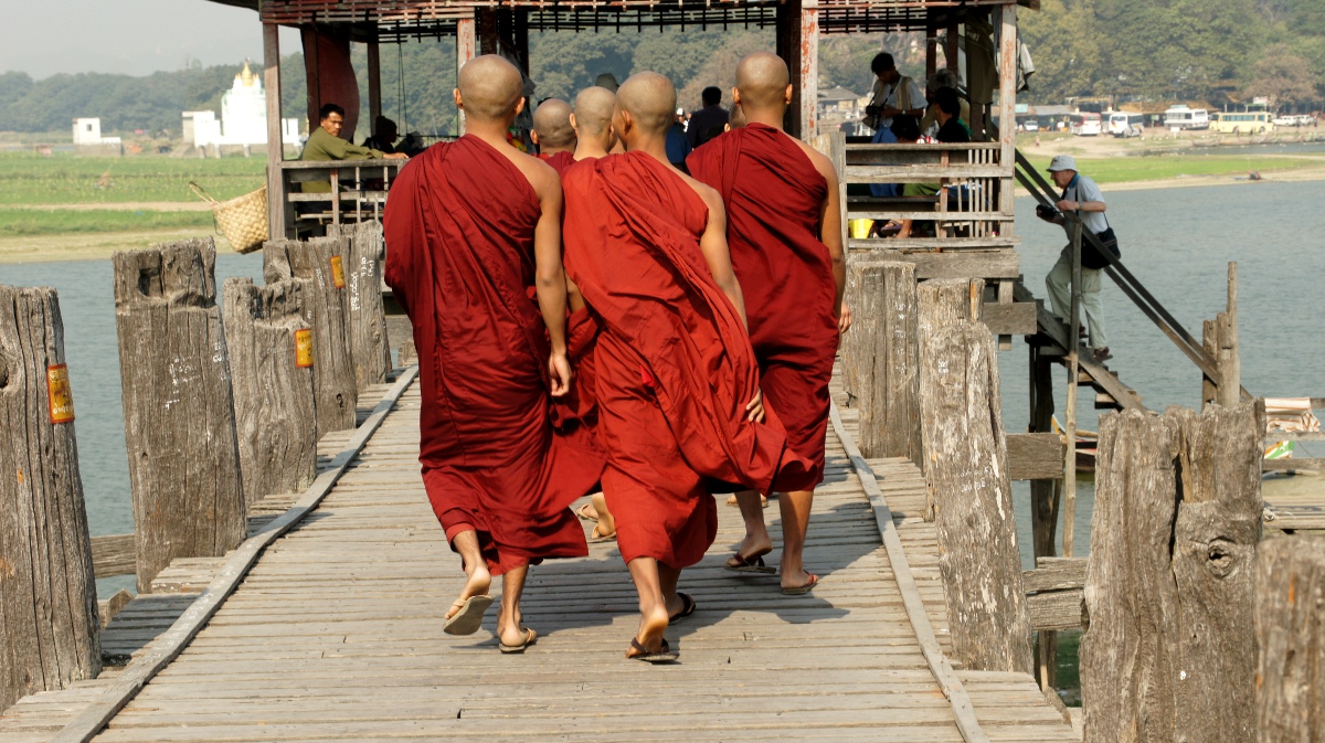 Auf der längsten Teakholz-Brücke der Welt vertreten wir uns die Beine und begegnen immer wieder buddhistischen Mönchen. Kein Wunder, im nahen Kloster leben nämlich ca. 1000. Um 10.30 Uhr stellen sich alle diese Mönche in zwei Reihen auf, um sich die zweite und letzte Mahlzeit des Tages zu holen. Mit ihnen warten etwa gleich viele Touristen, die ihre Kameras gezückt haben. Toll aussehen tut es trotzdem. Als nächstes besuchen wir die Mahamuni Pagode (wir sind etwas enttäuscht, hatten wir doch eine Pagode aus Mahagoni erwartet). Der riesige goldene Buddha entschädigt uns dann etwas. Dank der dicken Schicht Blattgold, welche täglich von den Gläubigen erweitert wird, sieht er schon richtig knubbelig aus. Nur die Männer dürfen übrigens diese Statue von nahem betrachten.