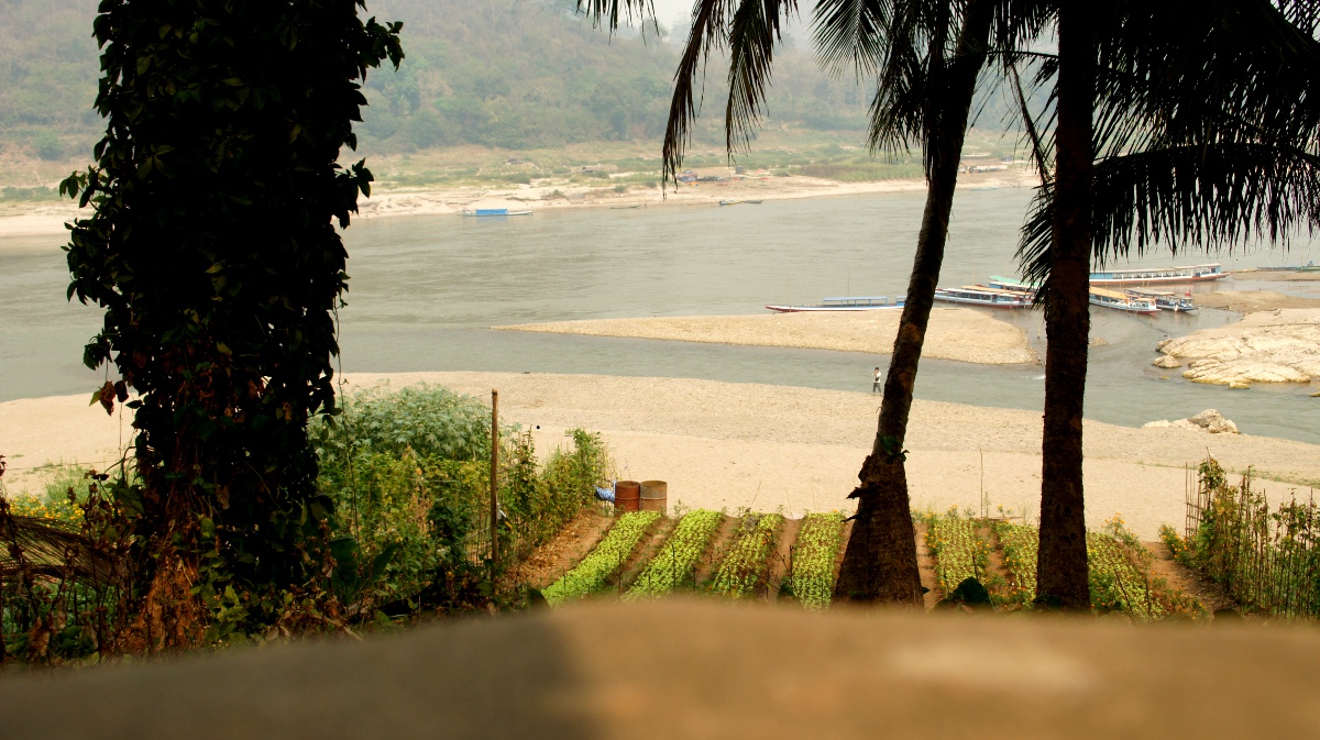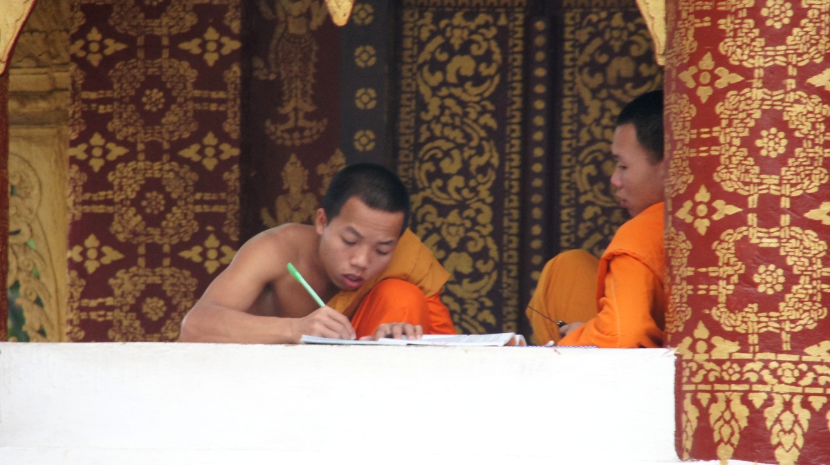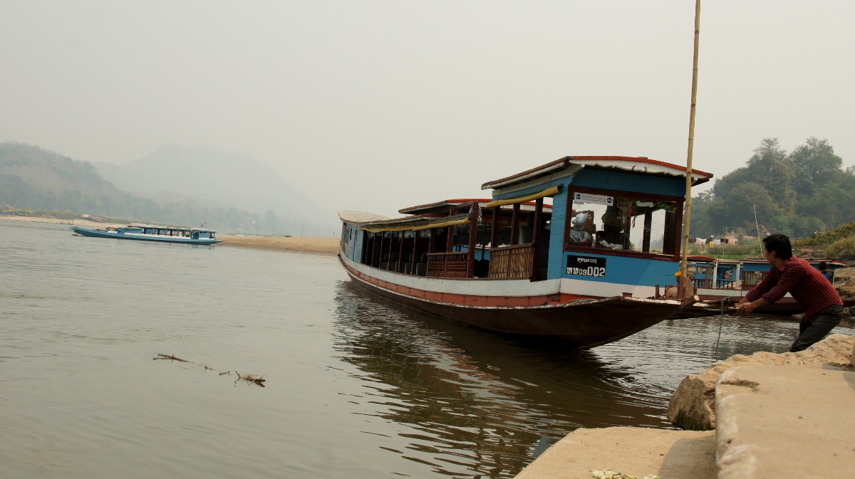 Am nächsten Morgen geht es Andrea definitiv wieder gut. Banana Pancake zum FrĂĽhstĂĽck… lecker. Dem Nam Khan Fluss entlang laufen wir bis zur MĂĽndung in den Mekong, wo die vielen Touristenboote auf Kundschaft warten. Als ehemalige Königsresidenz hat Luang Prabang so einiges an heilligen Bauten zu bieten. Den Wat May schauen wir uns dann als erstes an. Die Mittagshitze setzt uns allerdings etwas zu. Wir machen Pause, spielen und teilen uns eine Pizza.