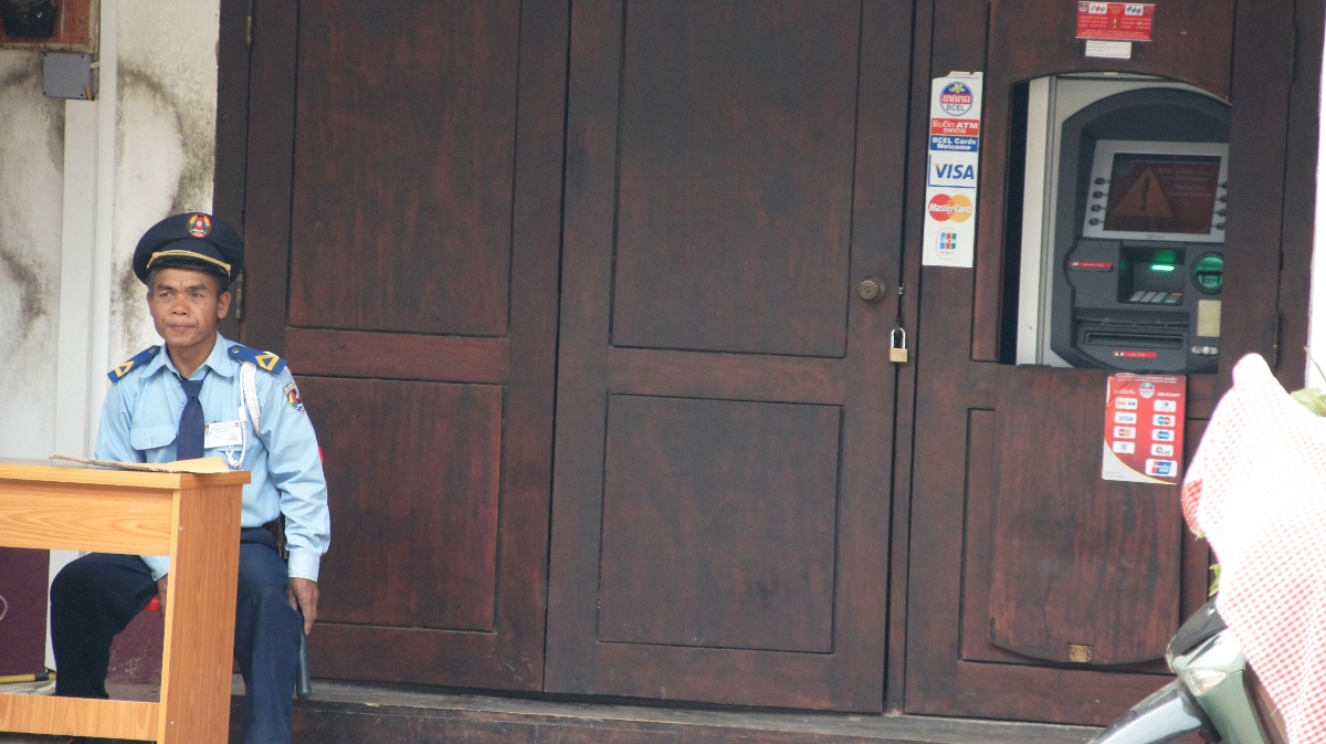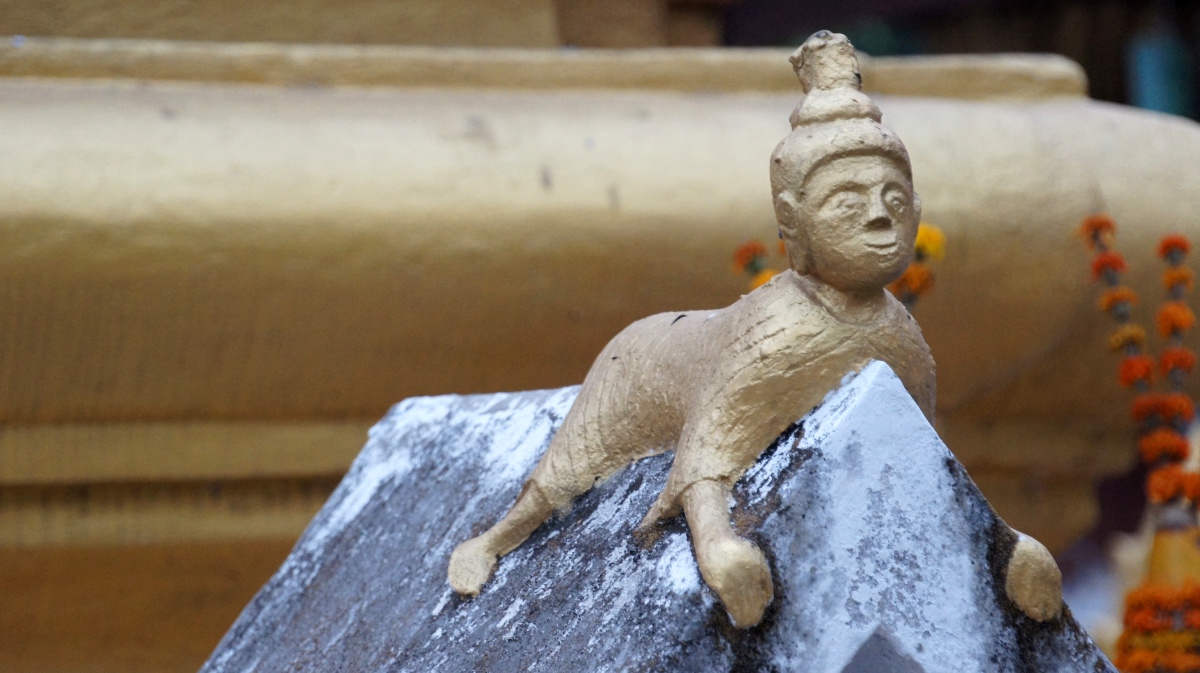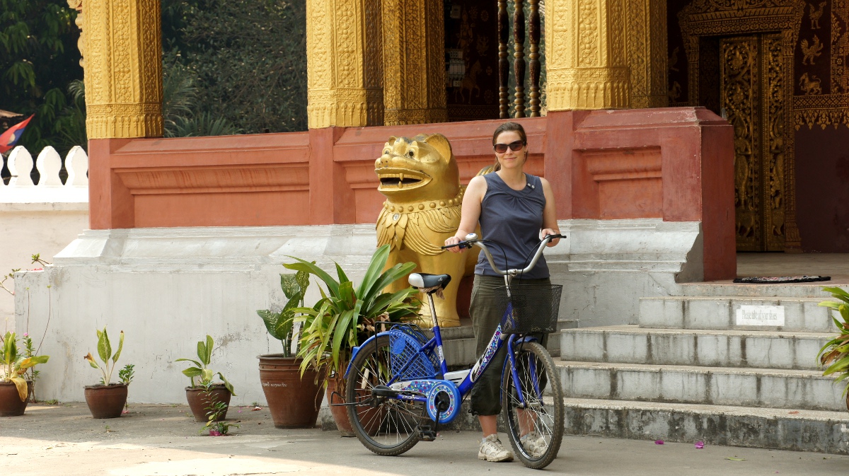 Am nächsten Tag leihen wir uns Rosinante 1 + 2 aus(ohne Gangschaltung; bei steilen Abfahrten machen wir die Fussbremse parat). Die Radtour führt uns aus der Stadt heraus bis zu einem kleinen Webereidorf. Auf der kurvigen Fahrt fängt Andreas Po zu schmerzen an. Also kehren wir langsam in die Stadt zurück und radeln langsam den Tempeln entlang. Das ist total gemütlich! Nach der sportlichen Höchstleistung gönnen wir uns dann eine Lao Massage (fast wie Thai Massage, 1 Stunde kostet 5 Franken). Die Verständigung mit dem Personal stellt sich als ziemlich schwierig heraus. Wir können weder genau herausfinden welche Massage wir bekommen, wie lange sie dauert, noch was wir denn genau ausziehen sollen. Aha, auch die Hosen müssen runter. Eher wenige wohlige Entspannungsmomente gehören wohl zur Lao Massage. Wir werden vom Kopf bis zum kleinen Zeh intensiv bearbeitet. Sind die Fersenschmerzen der nächsten Tage von Roli evtl. auf die Massage zurück zu führen?
