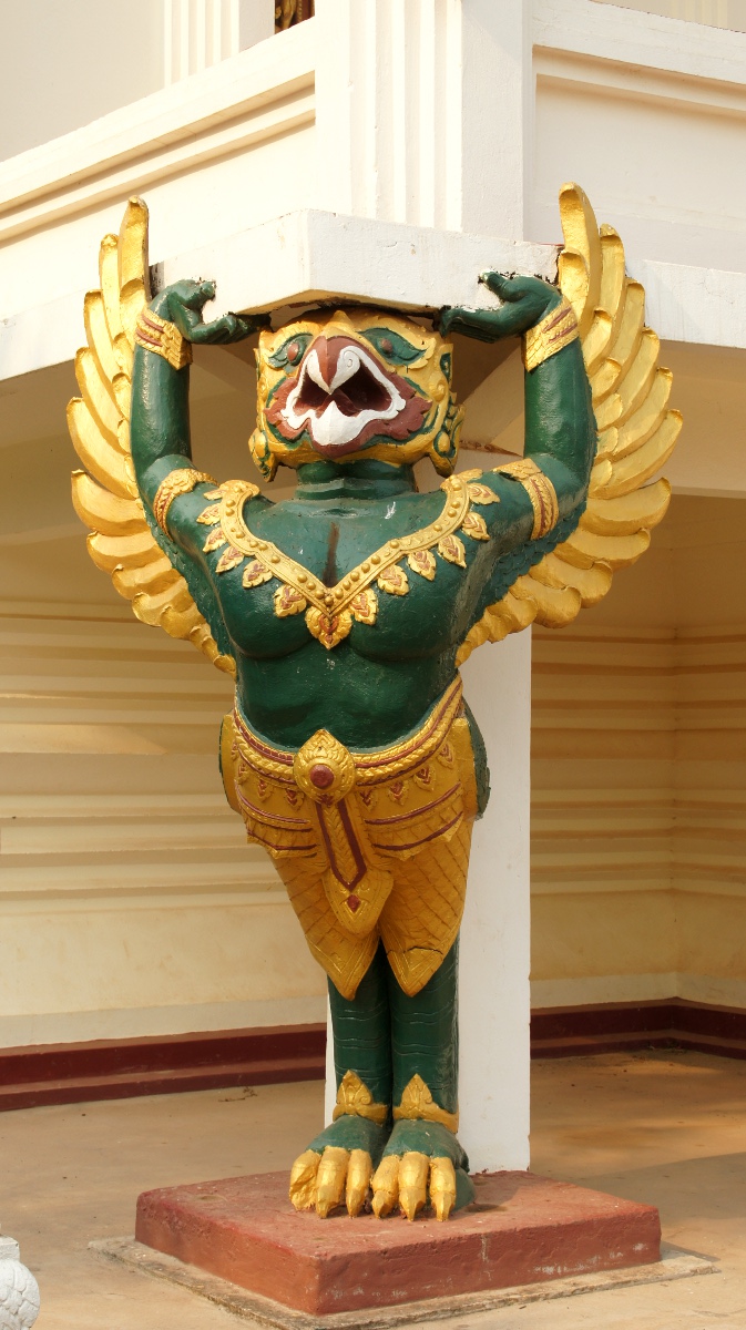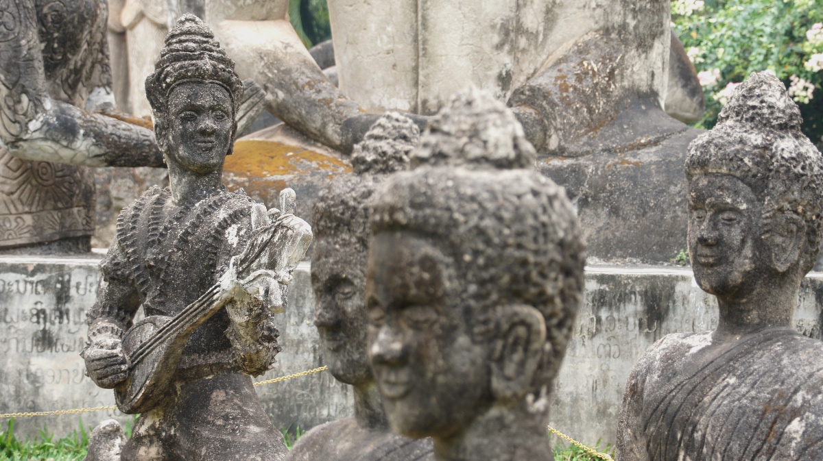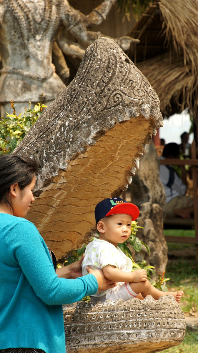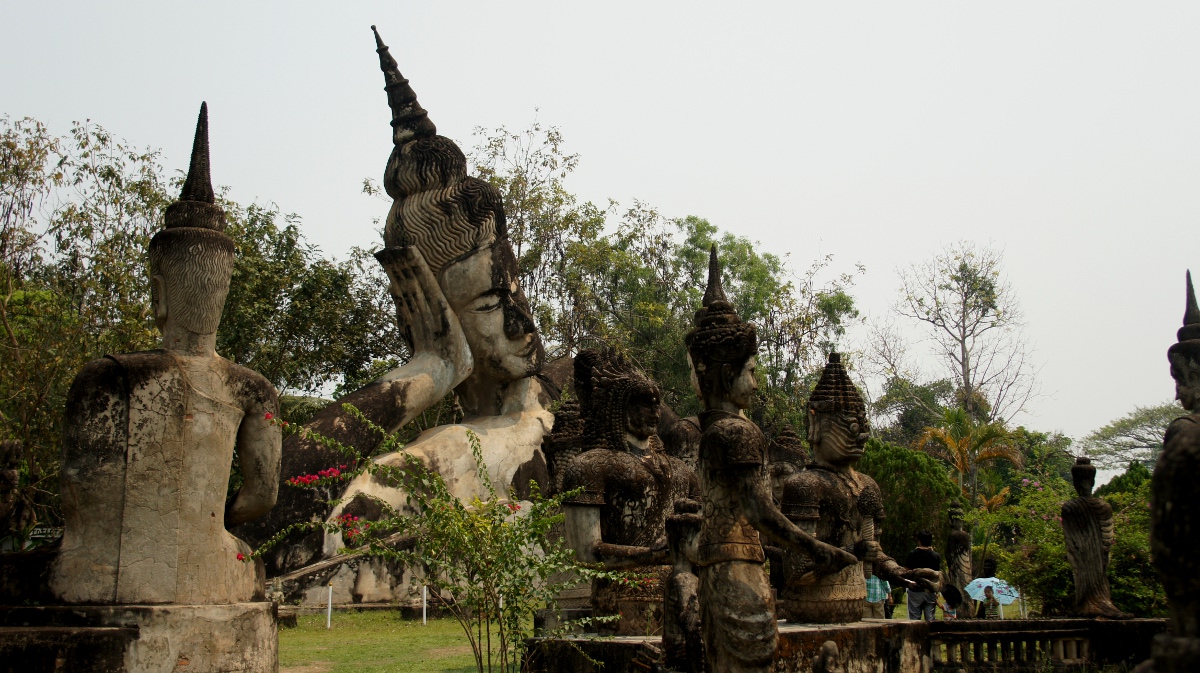 Mit dem öffentlichen Bus wollen wir am zweiten Tag die 25 Kilometer zum Wat Xieng Khuan, dem Buddha-Park fahren. Sobald wir den Busbahnhof betreten werden wir belagert von Túk Túk Fahrern, die uns direkt hin bringen möchten. Am Billettschalter winken sie uns weiter. Ein Túk Túk Fahrer kommt uns zu Hilfe und zeigt uns den Weg zu Bus Nr. 14. Dieser kommt gerade angerollt und füllt sich Ruck Zuck. Bis wir uns versichert haben, dass es der richtige Bus ist und man ohne Billett einsteigen muss, sind im kleinen Bus nur noch Stehplätze vorhanden. Etwas überrascht sehen wir, dass der Bus Richtung Freundschaftsbrücke (Grenze zu Thailand) fährt. Glück gehabt. Vor der Brücke gibts einen U-Turn und dann eine Haltestellen. Sicherheitshalber fragen wir herum ob jemand englisch spricht. Ein Mädchen meldet sich schliesslich. Sie will auch zum Buddha-Park. We can go together, meinte sie mit einem Kichern. Die grossen Betonfiguren (Buddhistische und laotische Sagenfiguren) sind recht skurril, gefallen uns aber gut. Die feuchte Hitze und die vielen laotischen Familen die überall für Fotos posieren und und natürlich immer vor die Linse stehen, zwingen uns zu einer Mittagspause. Nach der Rückfahrt geniessen wir am Mekong einen Sundowner. Übrigens ist in Laos am 8. März ein Feiertag (Tag der Frau). Deshalb wohl die vielen Familien im Buddha-Park.
