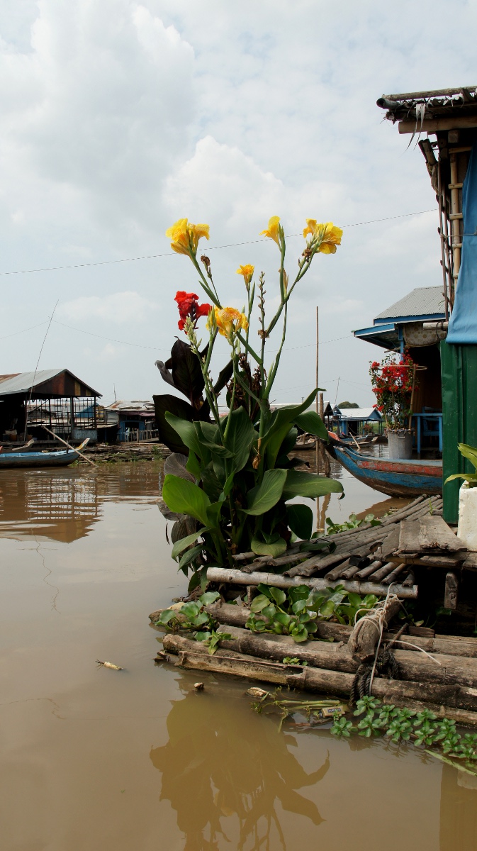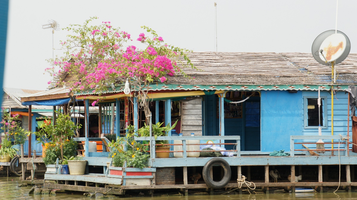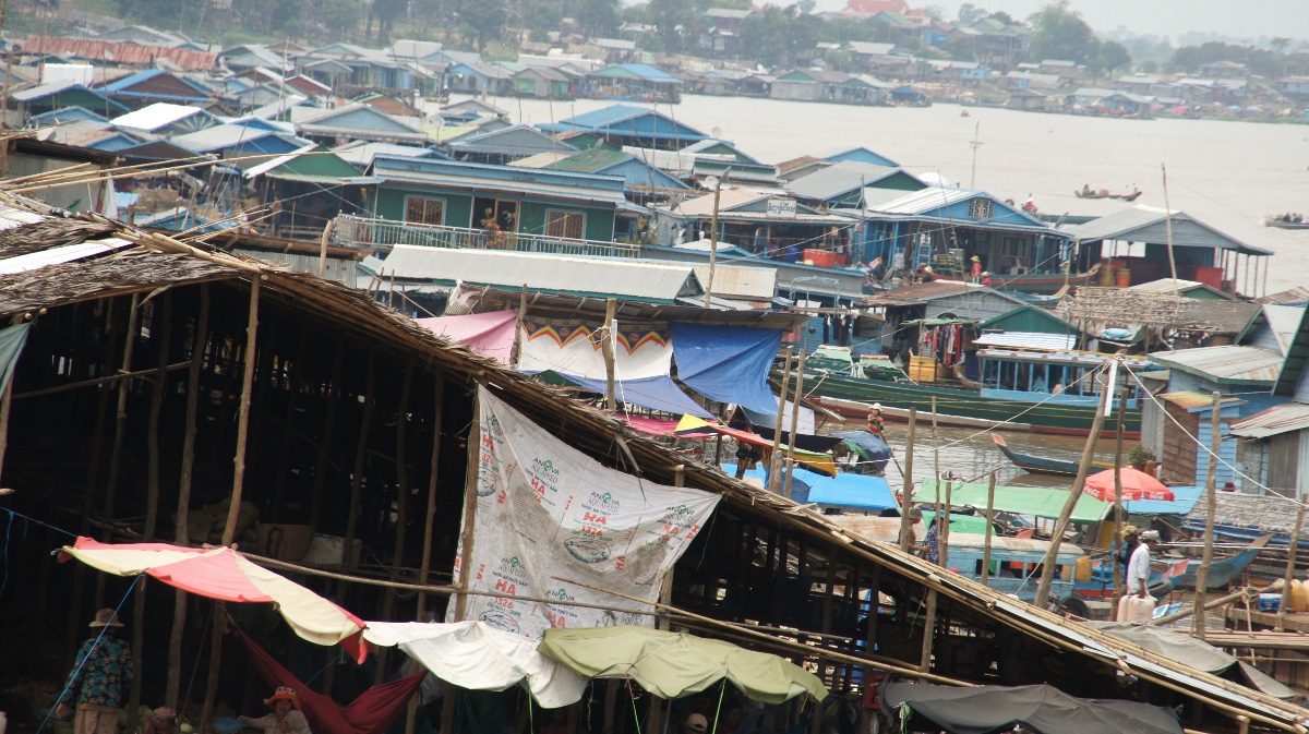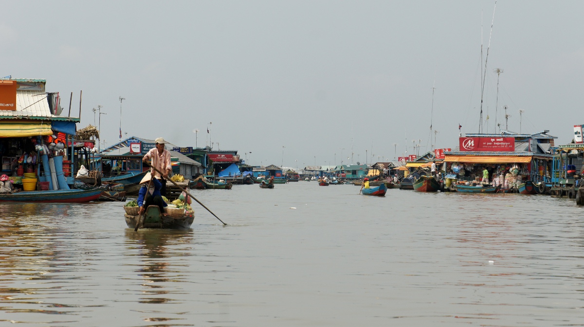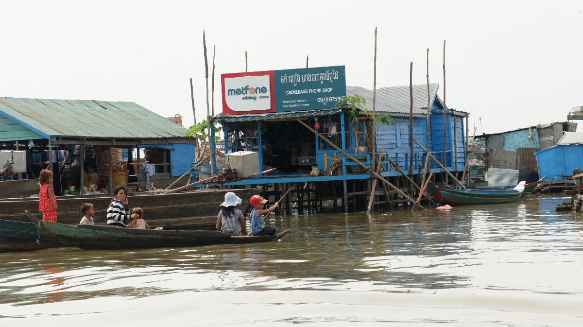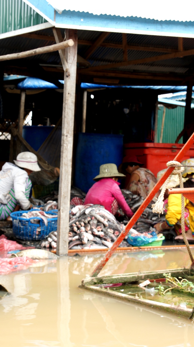 Am nächsten Tag holt er uns zeitig ab und wir werden an den Tonle Sap-See chauffiert. Die Bootsrundfahrt mitten durch das schwimmende Dorf Kompong Luong ist total lässig. Wir haben Einblick in Wohnzimmer, Handy-Shops, Kirche und Schule. Die Fischerfamilien entschuppen hunderte von Fischen auf ihren Veranden. Eine Gemüsehändlerin fährt mit ihrer auf dem Boot ausgelegten Ware wie wir an den Hausbooten vorbei. Später quert dann noch ein schwimmendes Restaurant unseren Weg.