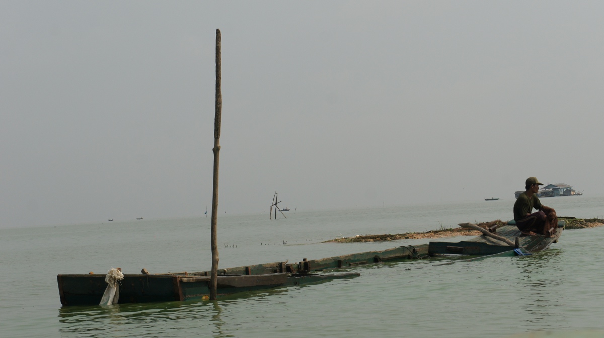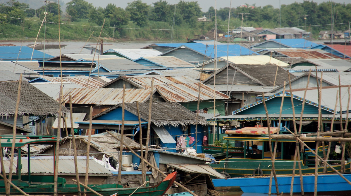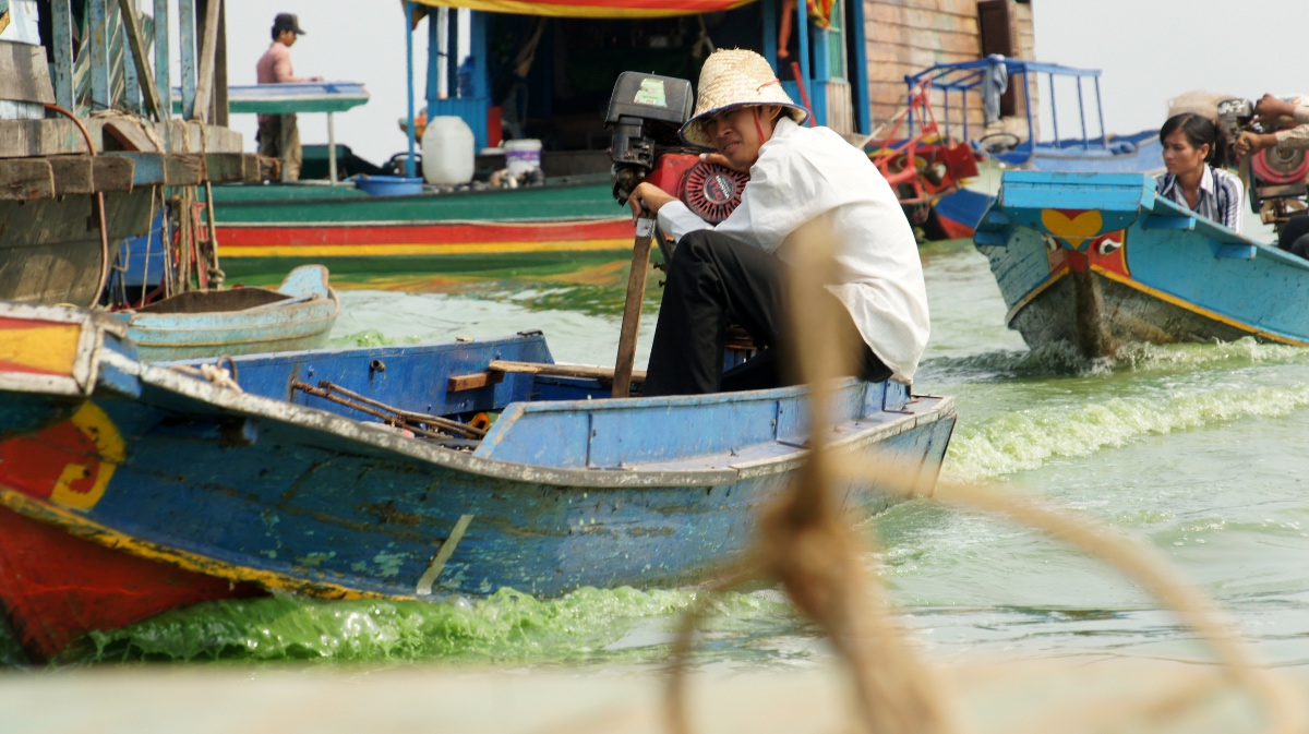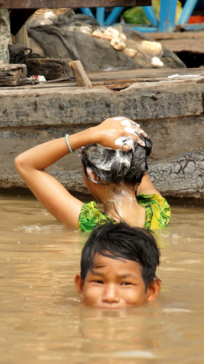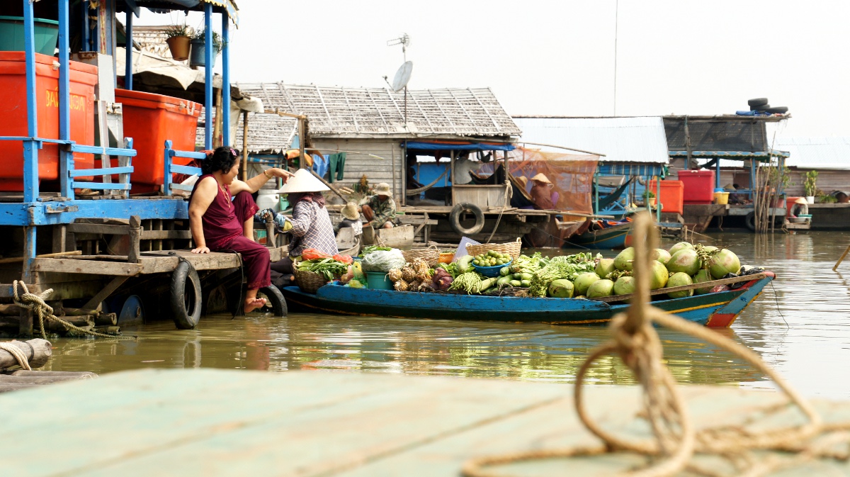 Am nächsten Tag holt er uns zeitig ab und wir werden an den Tonle Sap-See chauffiert. Die Bootsrundfahrt mitten durch das schwimmende Dorf Kompong Luong ist total lässig. Wir haben Einblick in Wohnzimmer, Handy-Shops, Kirche und Schule. Die Fischerfamilien entschuppen hunderte von Fischen auf ihren Veranden. Eine Gemüsehändlerin fährt mit ihrer auf dem Boot ausgelegten Ware wie wir an den Hausbooten vorbei. Später quert dann noch ein schwimmendes Restaurant unseren Weg.
