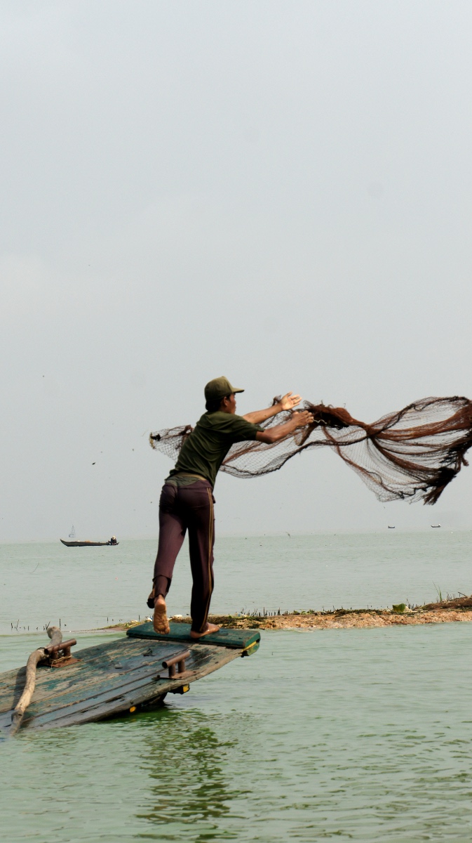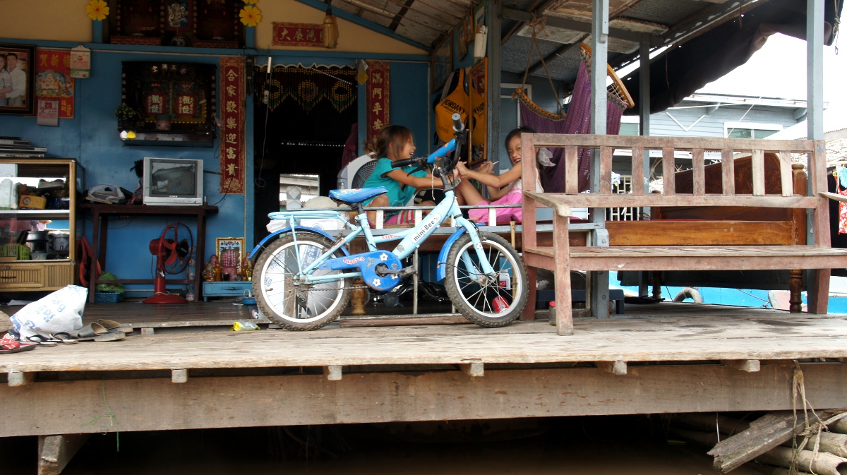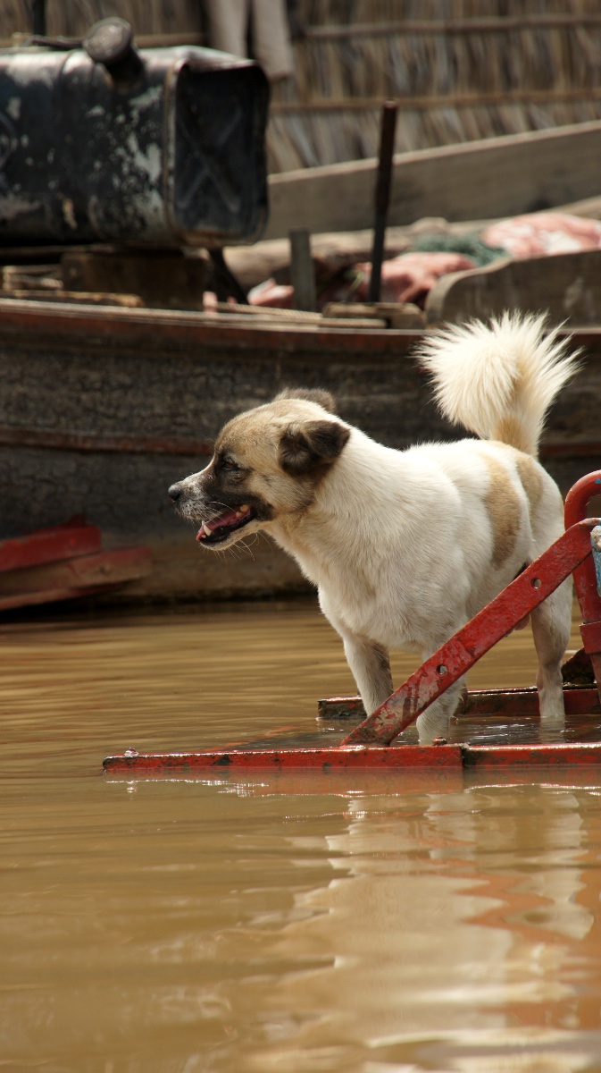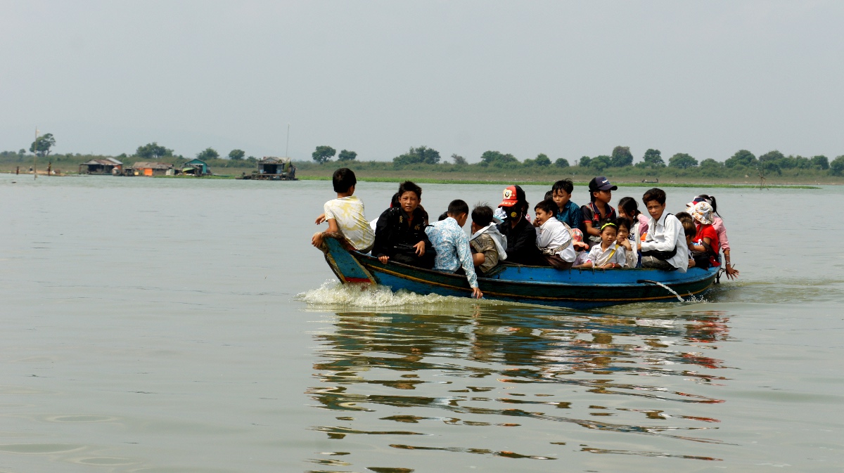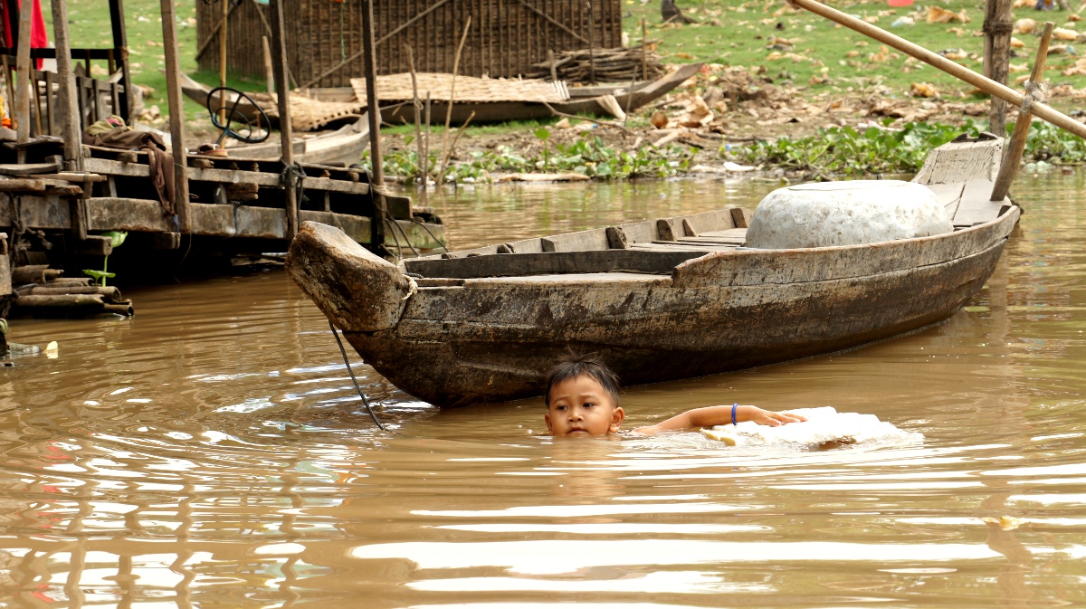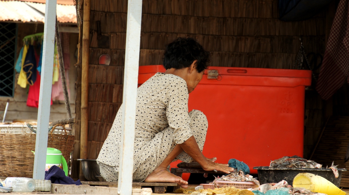 Am nächsten Tag holt er uns zeitig ab und wir werden an den Tonle Sap-See chauffiert. Die Bootsrundfahrt mitten durch das schwimmende Dorf Kompong Luong ist total lässig. Wir haben Einblick in Wohnzimmer, Handy-Shops, Kirche und Schule. Die Fischerfamilien entschuppen hunderte von Fischen auf ihren Veranden. Eine Gemüsehändlerin fährt mit ihrer auf dem Boot ausgelegten Ware wie wir an den Hausbooten vorbei. Später quert dann noch ein schwimmendes Restaurant unseren Weg.