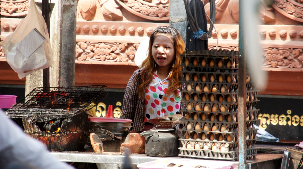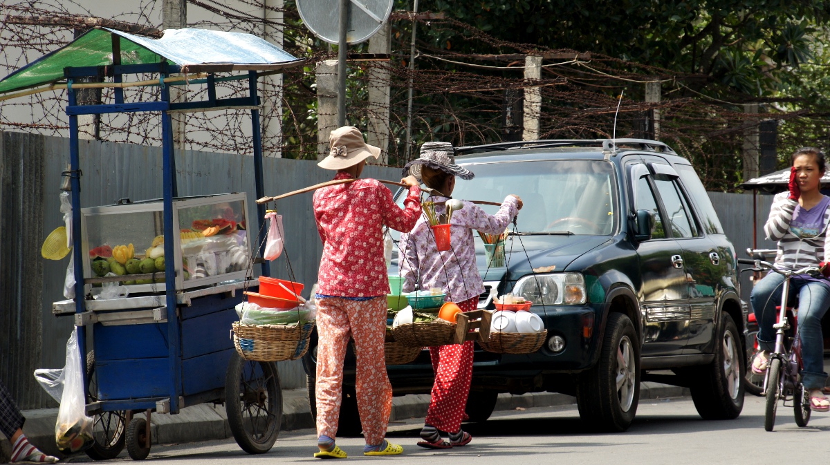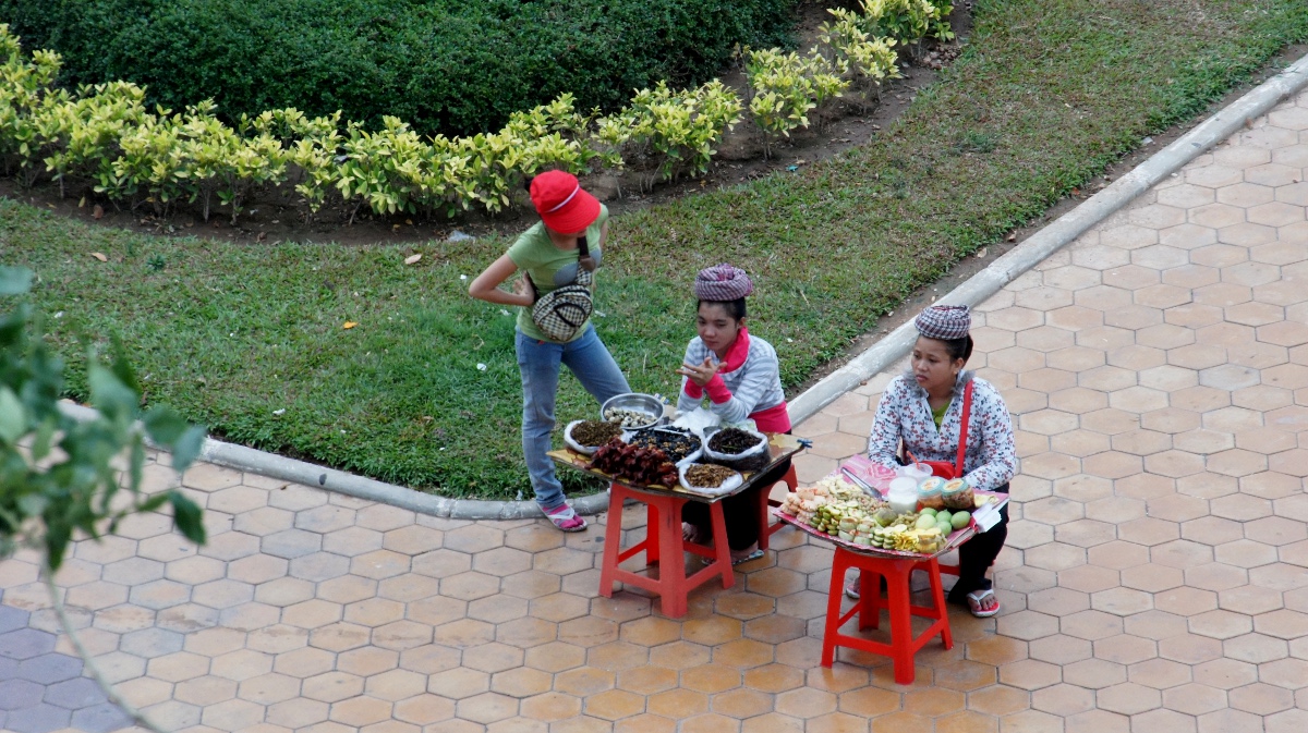 - Erdnüsse, Käfer, Fleischspiesse, Getränke – alles zu haben unterwegs