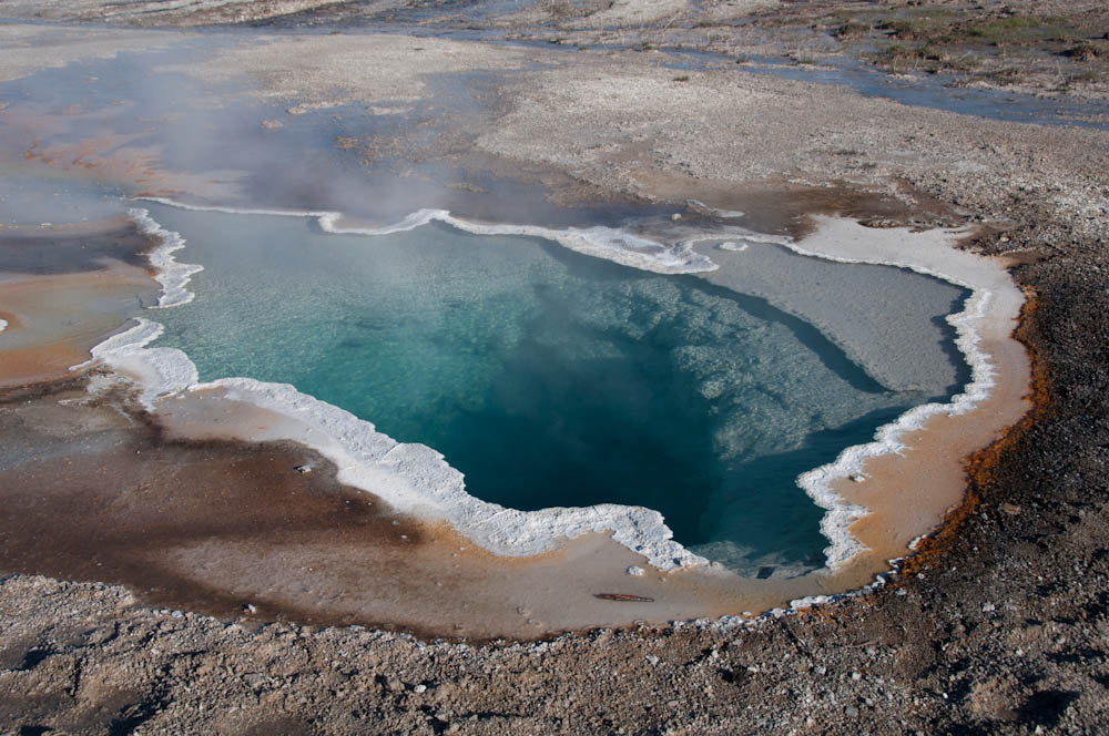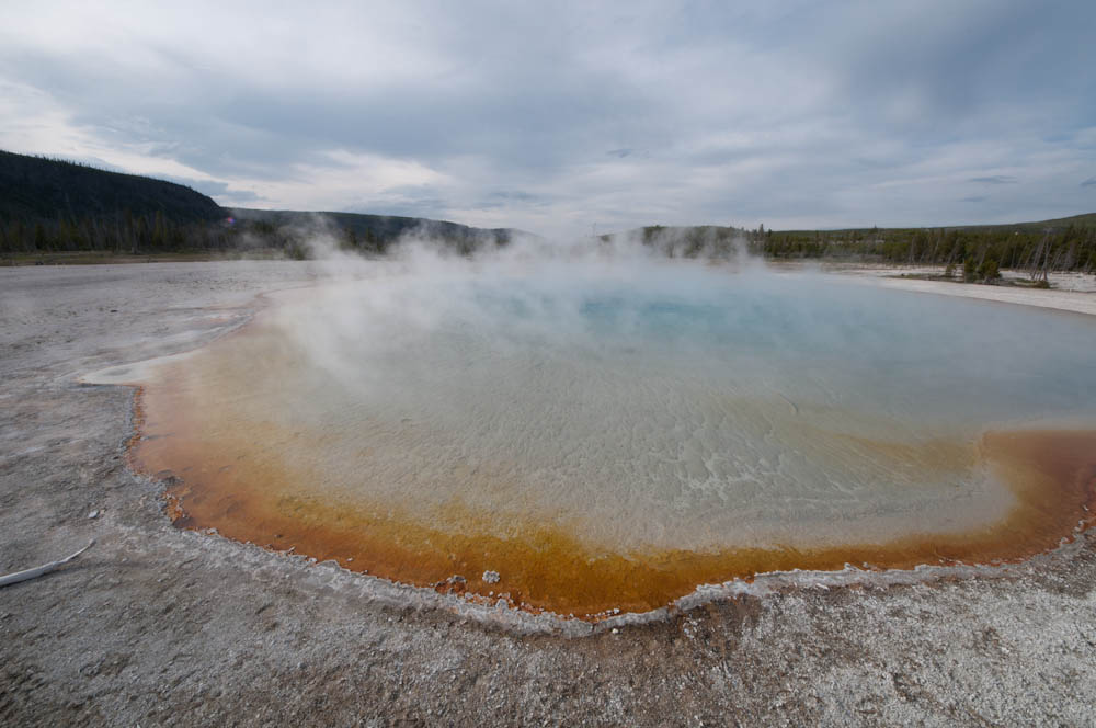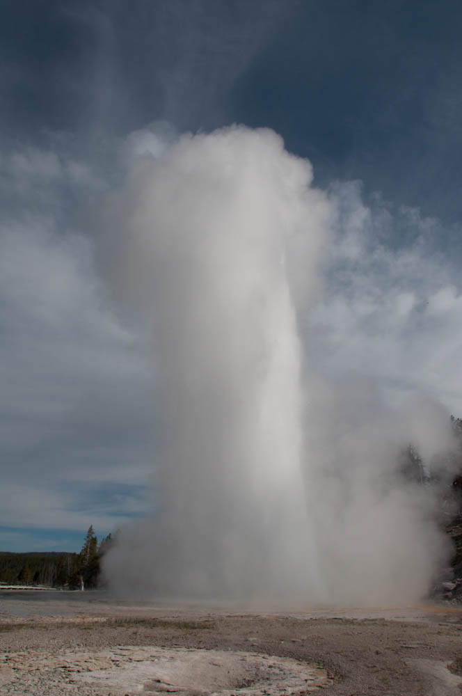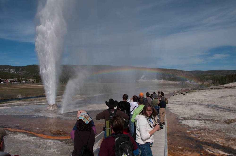 Früh am nächsten Morgen ging es dann zum Lower Geysir Basin, wo sich auch der bekannte „Old Faithful Geysir“ befand. Wieder hatten wir einen „Bison Jam“, trotzdem erreichten wir die Geysire noch vor sieben Uhr. Staunend betrachteten wir die dampfenden, stinkenden Bassins und sprundelnden Geysire. Bei einem Geysir wurde uns empfohlen auf den Ausbruch zu warten, denn dessen periodischer Ausbruch (etwa alle 12h) war bereits überfällig. Der Geysir zeigte aber noch keinen Willen zum Loslegen, allerdings sei auf der anderen Seite der „Grand Geysir“ kurz vor dem Ausbruch. Also begaben wir uns in schnellem Schritte auf die andere Seite des mit Holzsteg bebauten Gelände. Zwanzig Minuten später wurde unser Aufwand auch entschädigt: Mit Getöse und meterhohen Fontänen konnten wir den Ausbruch des „Grand Geysir“ bestaunen. Als sich der Geysir wieder schlafen legte, begaben wir uns zurück zum ersten Geysir, dem „Beehive Geysir“. Noch auf dem Weg hörten wir von dem vorher getroffenen, mit uns mitlaufenden Enthusiasten, das der Beehive kurz vor dem Ausbruch sei. Also rannten wir den Rest des Weges. Ausser puste mussten wir dennoch ca. eine viertel Stunde auf den Ausbruch warten. Der Geysir war jedoch noch eindrücklicher, das Wasser sprühte Meterhoch Richtung strahlend blauem Himmel.